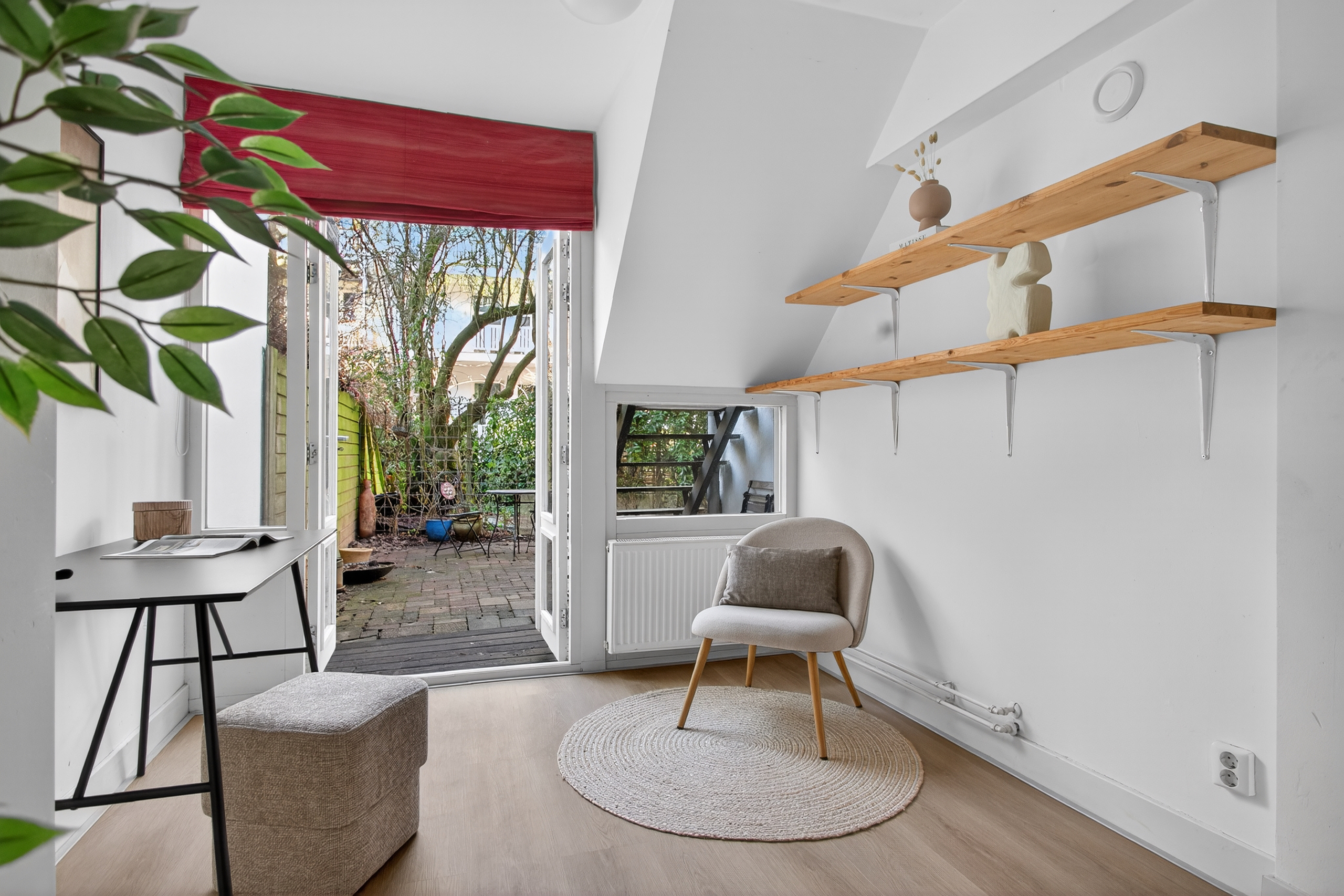 Aan de voorzijde bevindt zich de tweede kamer, die geschikt is als slaap-, werk- of logeerkamer. Dankzij de grote ramen valt hier veel daglicht naar binnen.