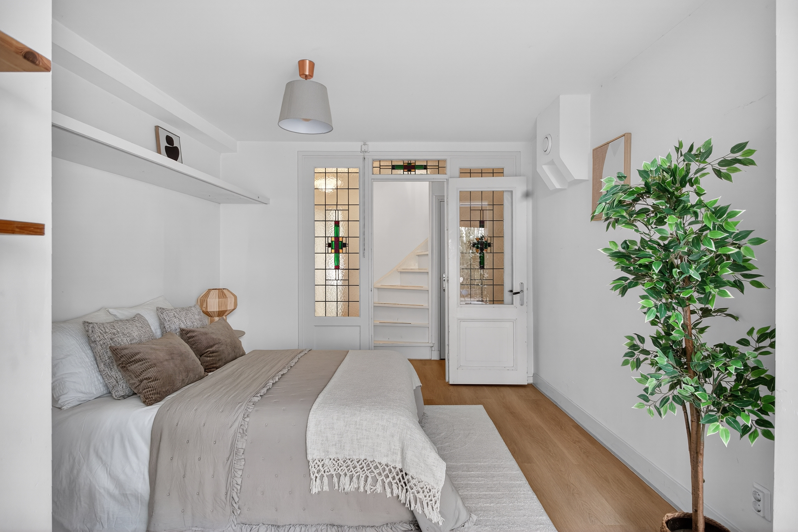 Here you will find two bedrooms, a bathroom, and storage space with a washing machine connection under the stairs. The spacious bedroom at the rear has French doors opening onto the garden, allowing you to step directly outside from the room. On this floor as well, stained-glass details reappear, perfectly complementing the authentic character of the home.