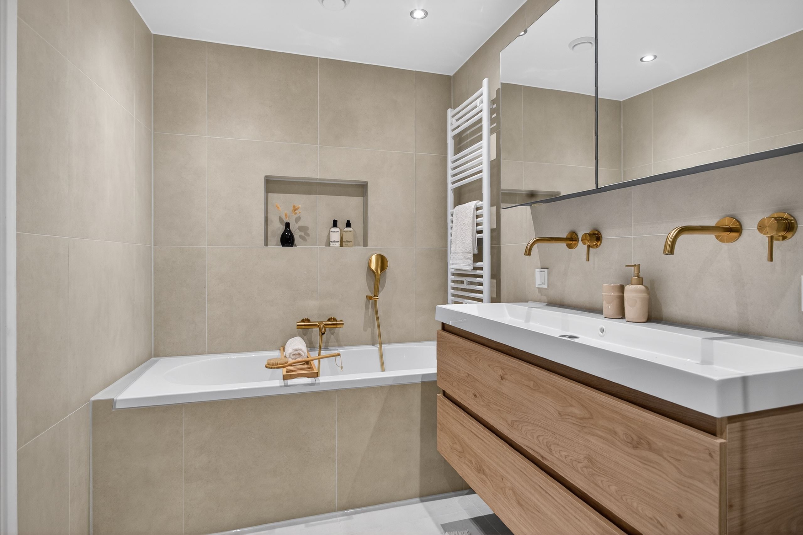 The bathroom has been fully renovated and beautifully finished with luxury sanitary fittings. It includes a bathtub, a spacious walk-in shower, a double washbasin with built-in faucets and vanity unit, a toilet, and a towel radiator. The bathroom also features underfloor heating and recessed ceiling spotlights.