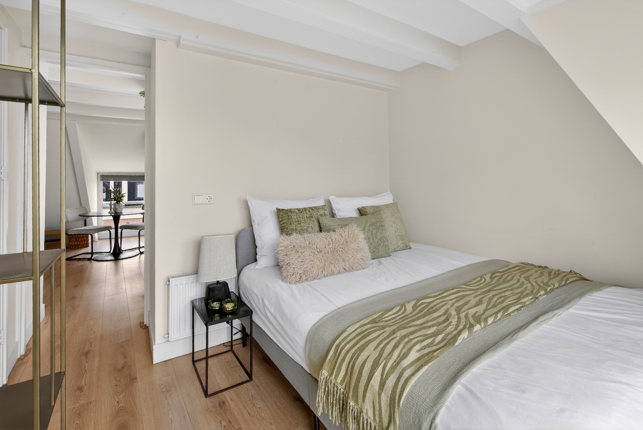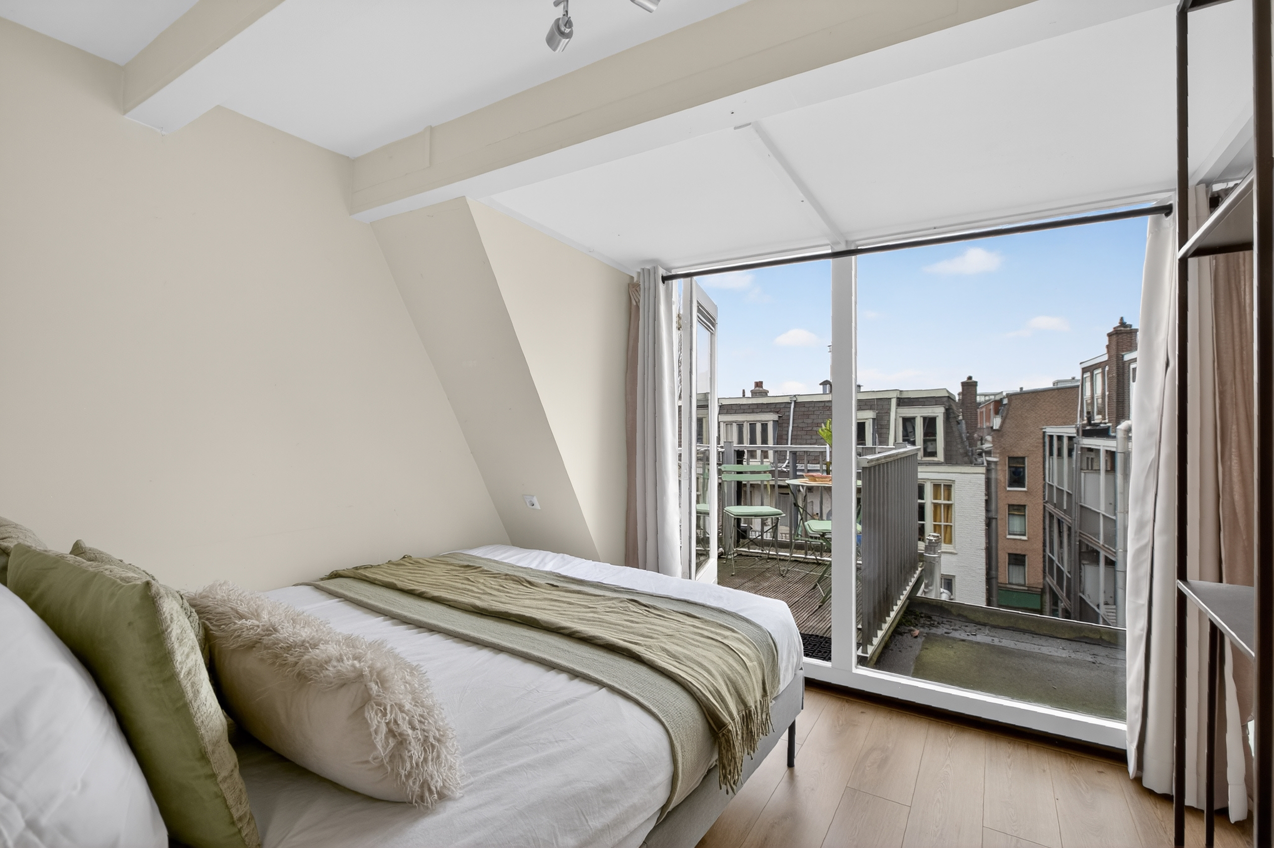 Op dezelfde verdieping bevindt zich de slaapkamer, die direct toegang geeft tot het balkon aan de achterzijde van de woning. Het balkon is een fijne plek om ’s ochtends rustig wakker te worden. Vanuit het appartement is bovendien het privé dakterras bereikbaar, waar je in alle rust kunt genieten van de buitenlucht en het stadsleven om je heen.