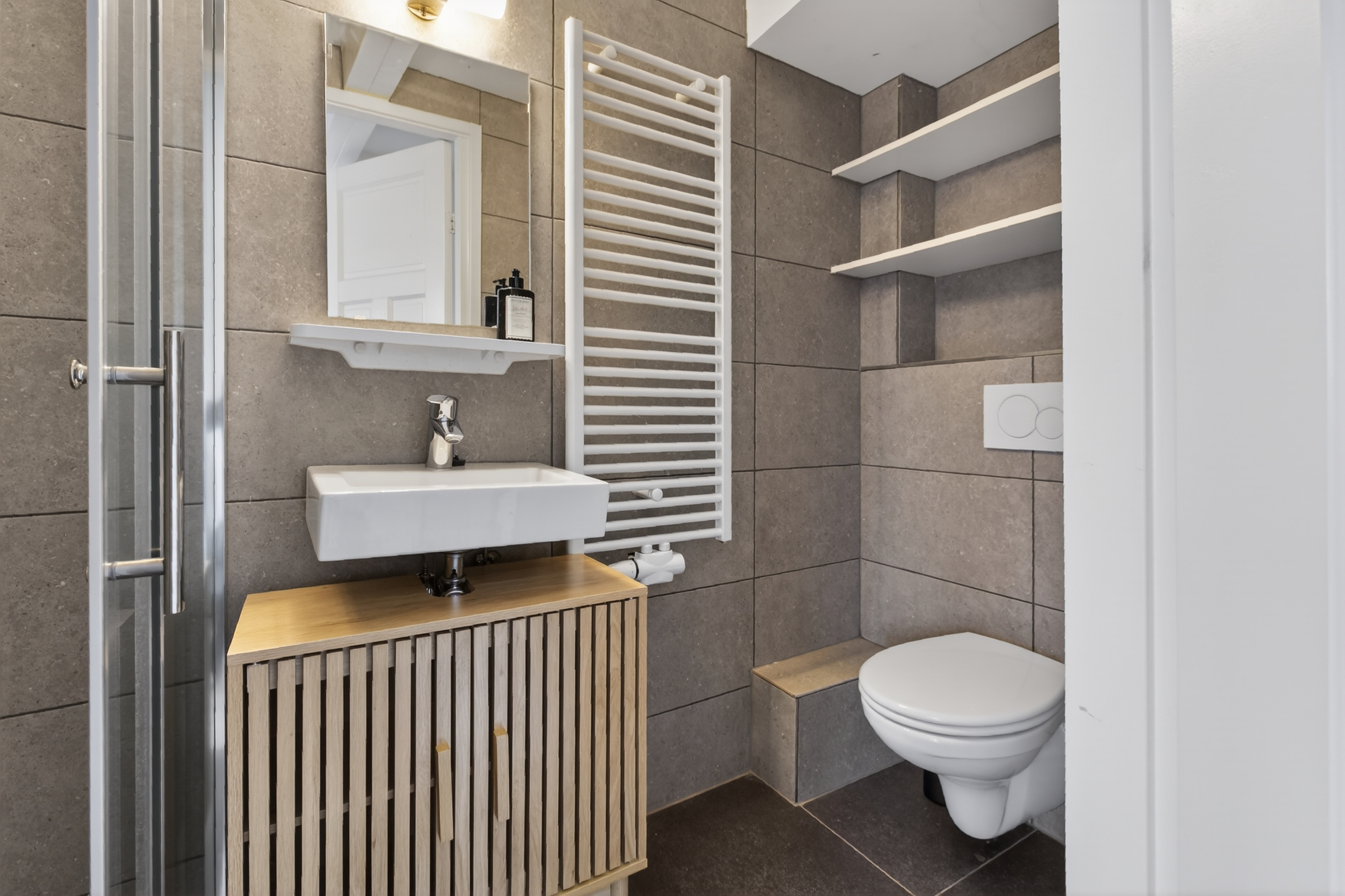 De badkamer is compact maar functioneel ingericht en voorzien van een douche, wastafel en toilet.