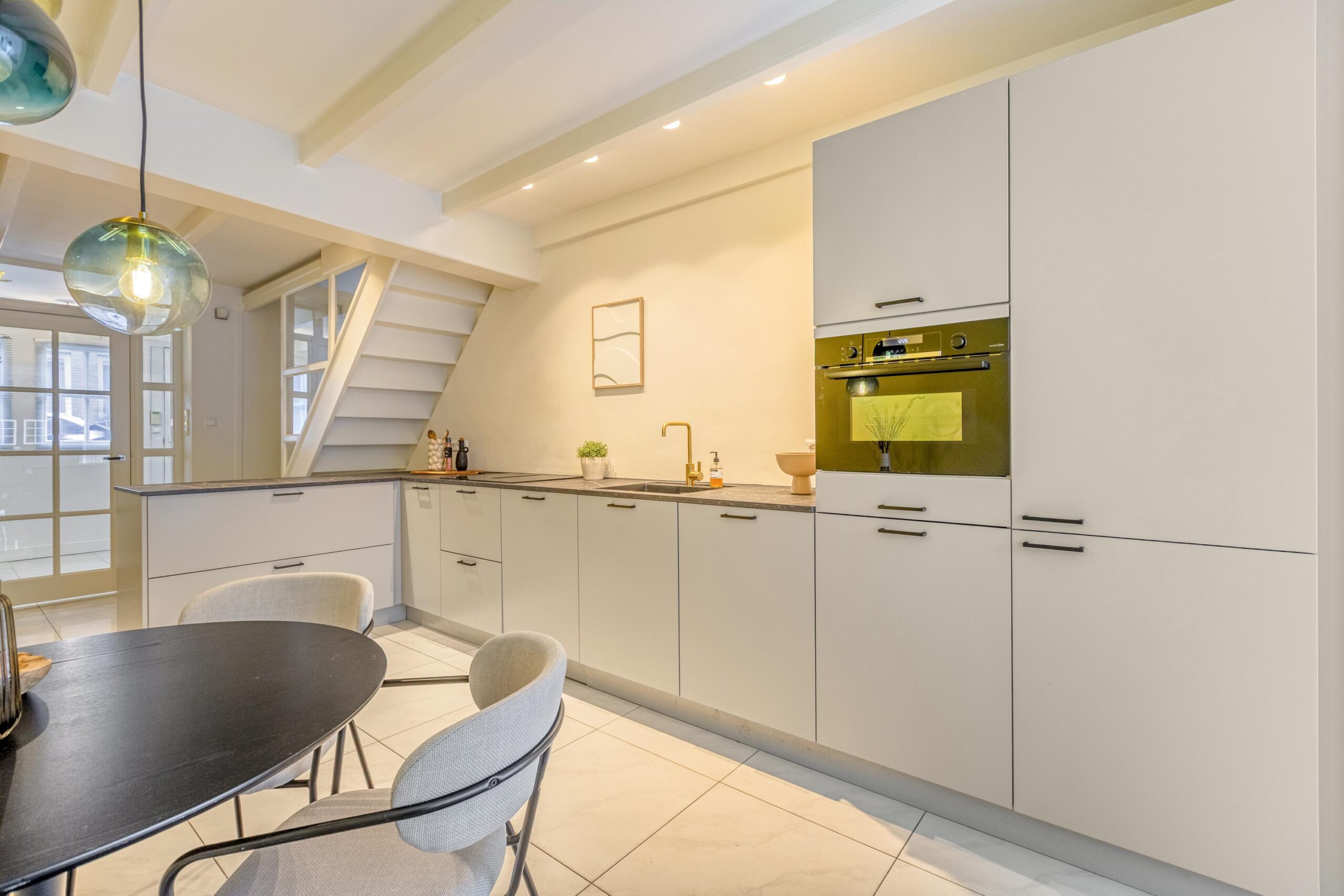 Centraal in de woning vindt u de trap naar boven. Hier komt de originele trapbalustrade mooi tot zijn recht.