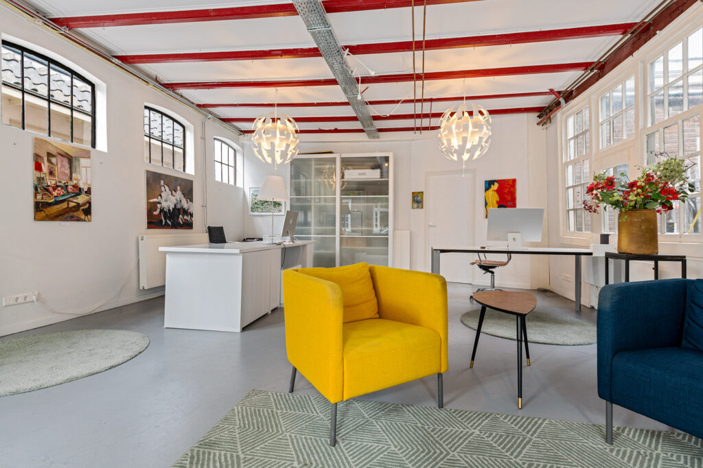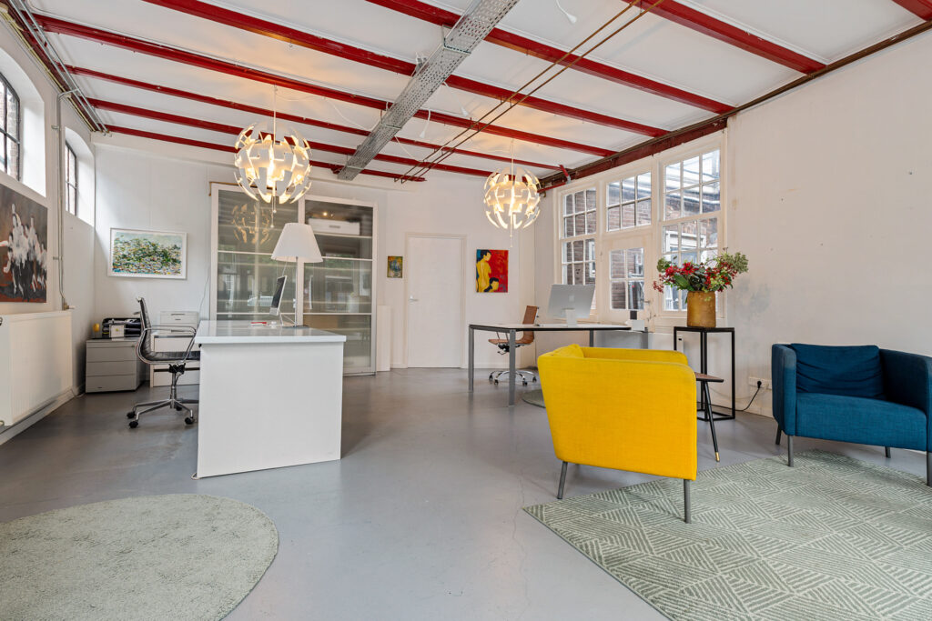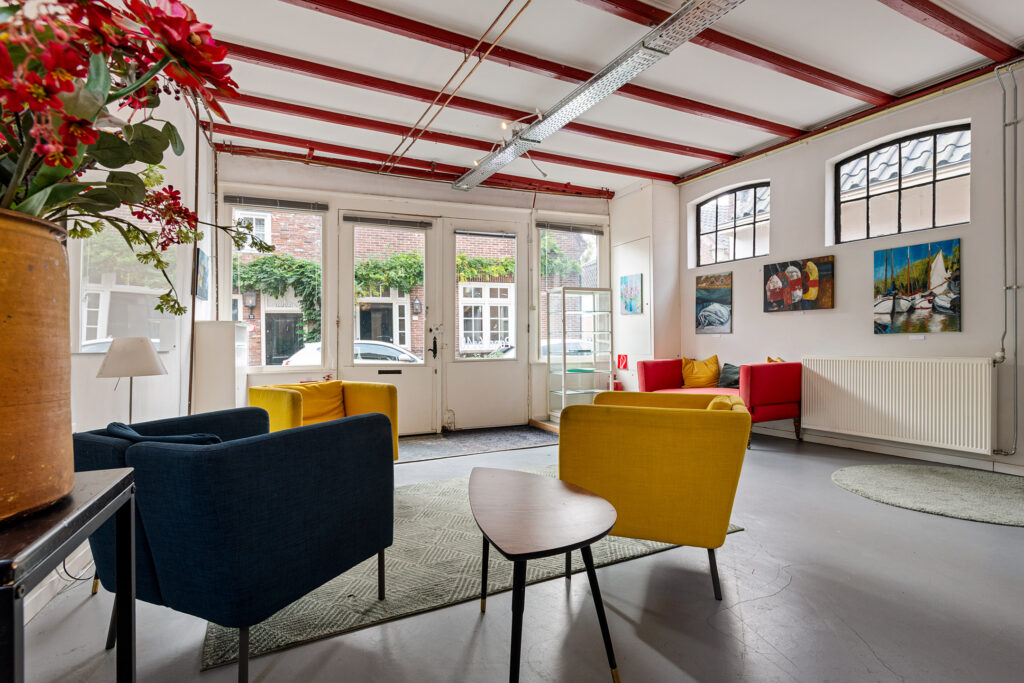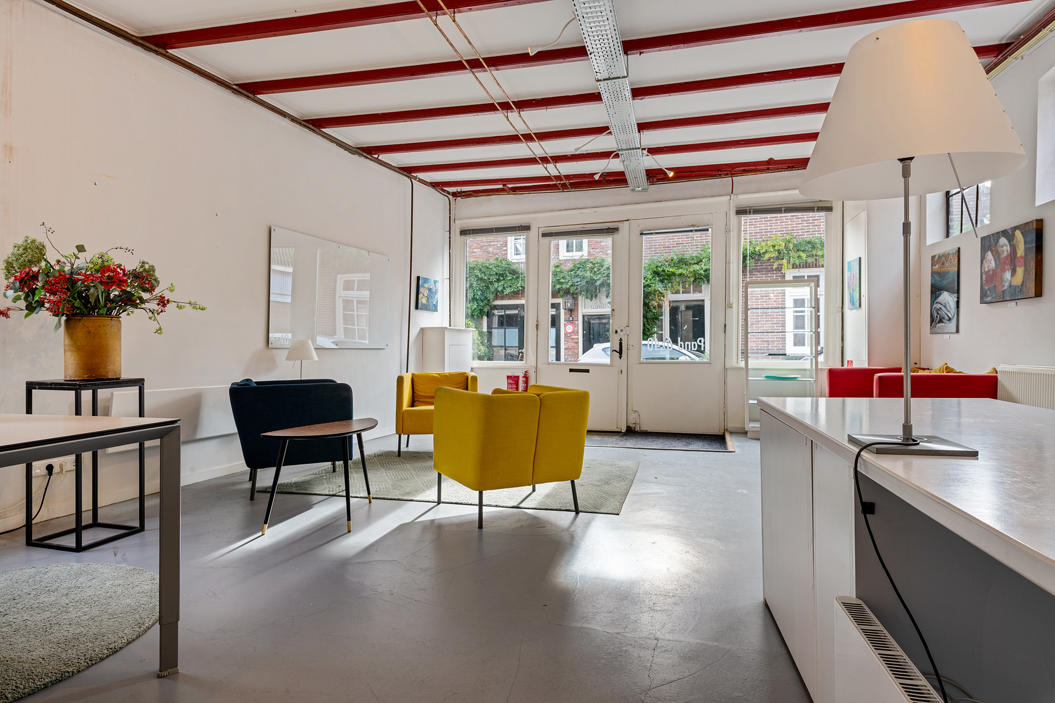 De begane grond wordt momenteel gebruikt als kantoorruimte. Bij binnenkomst is er een open, lichte ruimte met aan de voorzijde een zitgedeelte en aan de achterzijde een werkgedeelte. Achterin bevinden zich een keukenblok, een separaat toilet en de trap naar de eerste verdieping.