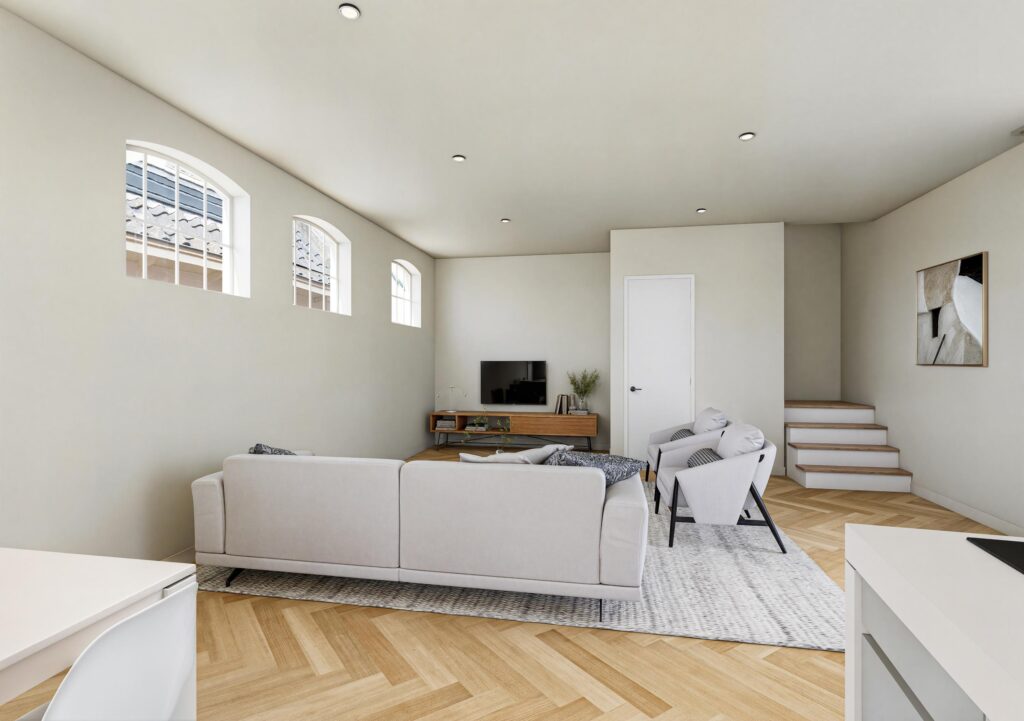 De eerste verdieping is ingericht als woonruimte. Bovenaan de trap bevindt zich een open hal met aansluitingen voor wasmachine en droger. Vanuit hier is er toegang tot de woonkamer met open keuken. Aan de voorzijde is een Frans balkon aanwezig. Daarnaast zijn er een badkamer met douche, toilet en wastafel, en een aangrenzende slaapkamer.
