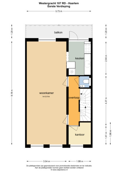 Overloop met toegang tot de gang, separaat toilet met fontein en een werk-/studeerkamer aan de voorzijde. De ruime en lichte woonkamer heeft aan de achterzijde een semi-open keuken met inbouwapparatuur en een deur naar een breed balkon over de gehele achterzijde van de woning.