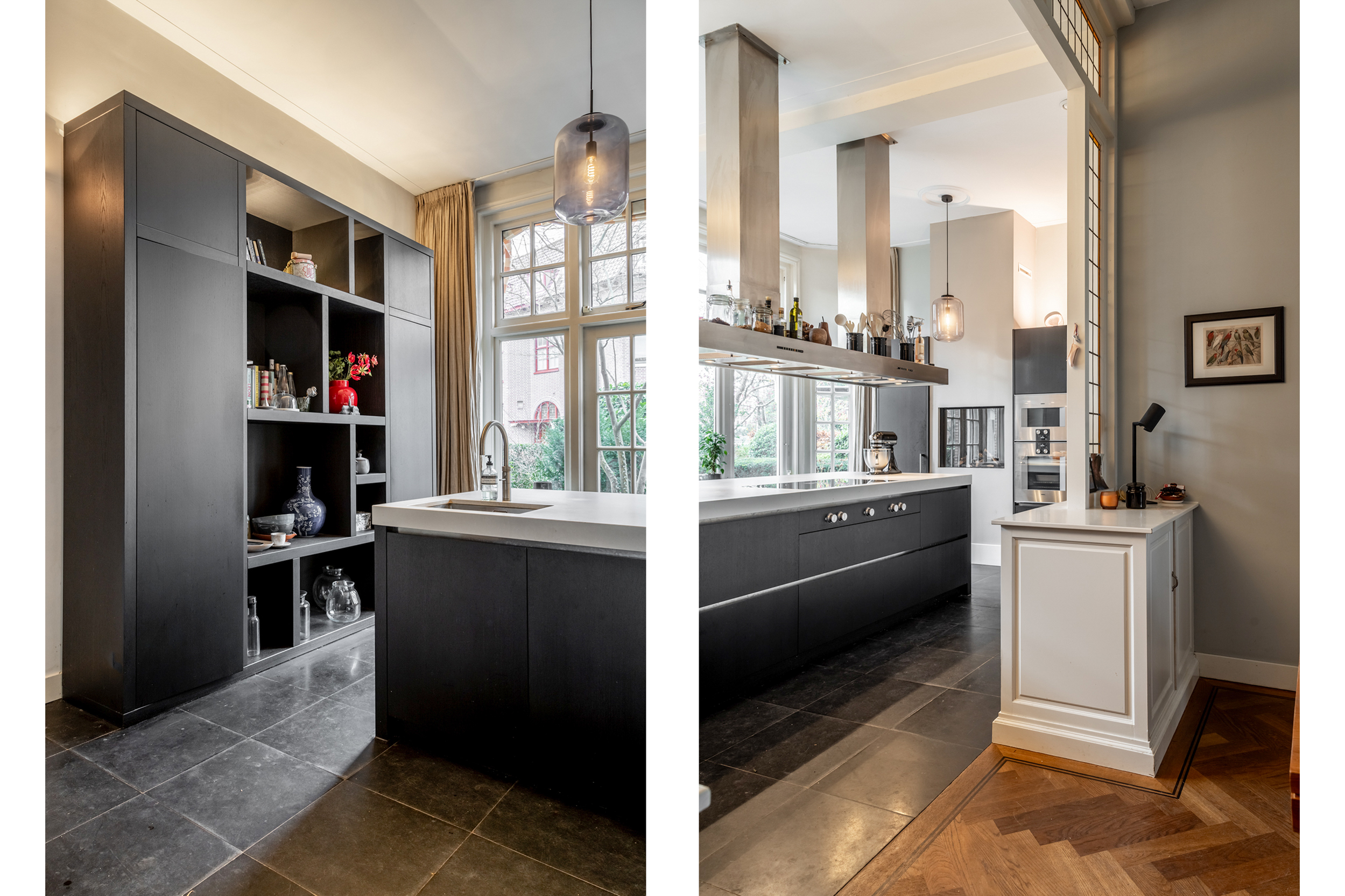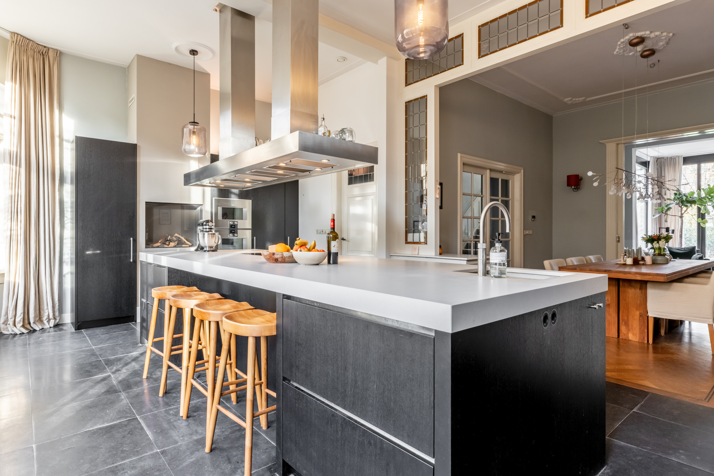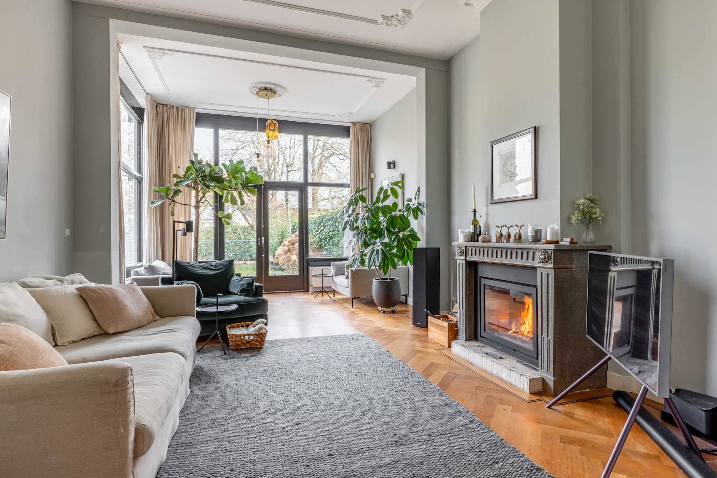 Through the front garden and entrance at the front, you enter a majestic spacious hall with separate cloakroom, elevator, and through cylinder glass plates on each floor, a view of the original stained glass skylight in the main roof and access to the various living areas. From the hall, there is access to a study/chill/television room at the rear of the house, as well as to a separate toilet. The hall leads further to the luxurious living room and kitchen at the front, which is the heart of the house, with a Lodder kitchen including a very large island with various Gaggenau appliances, Quooker, professional Gutmann extractor hood, gas fireplace, custom cabinets, and Belgian bluestone flooring. The kitchen also has large French doors to the front garden. From the kitchen, you enter the stately dining room with parquet flooring and, through stained glass sliding doors, the en-suite sitting room and conservatory with French natural stone fireplace, including a built-in Brabus fireplace. The conservatory has French doors to the sunny southeast-facing garden with a (enclosed) back entrance. The garden also has a large heated stone shed with electricity, hot water, refrigerator, and workbench, which also has direct access to the chill/television room.