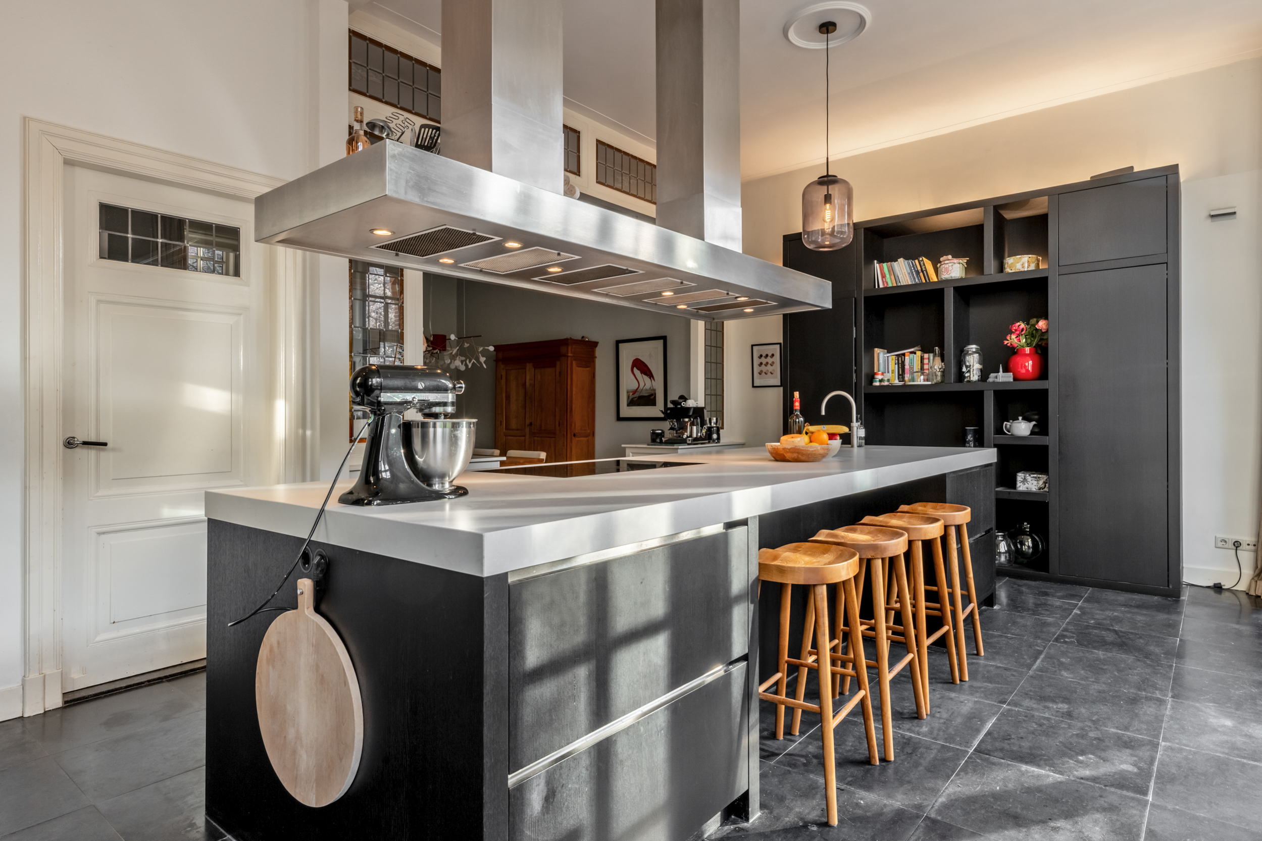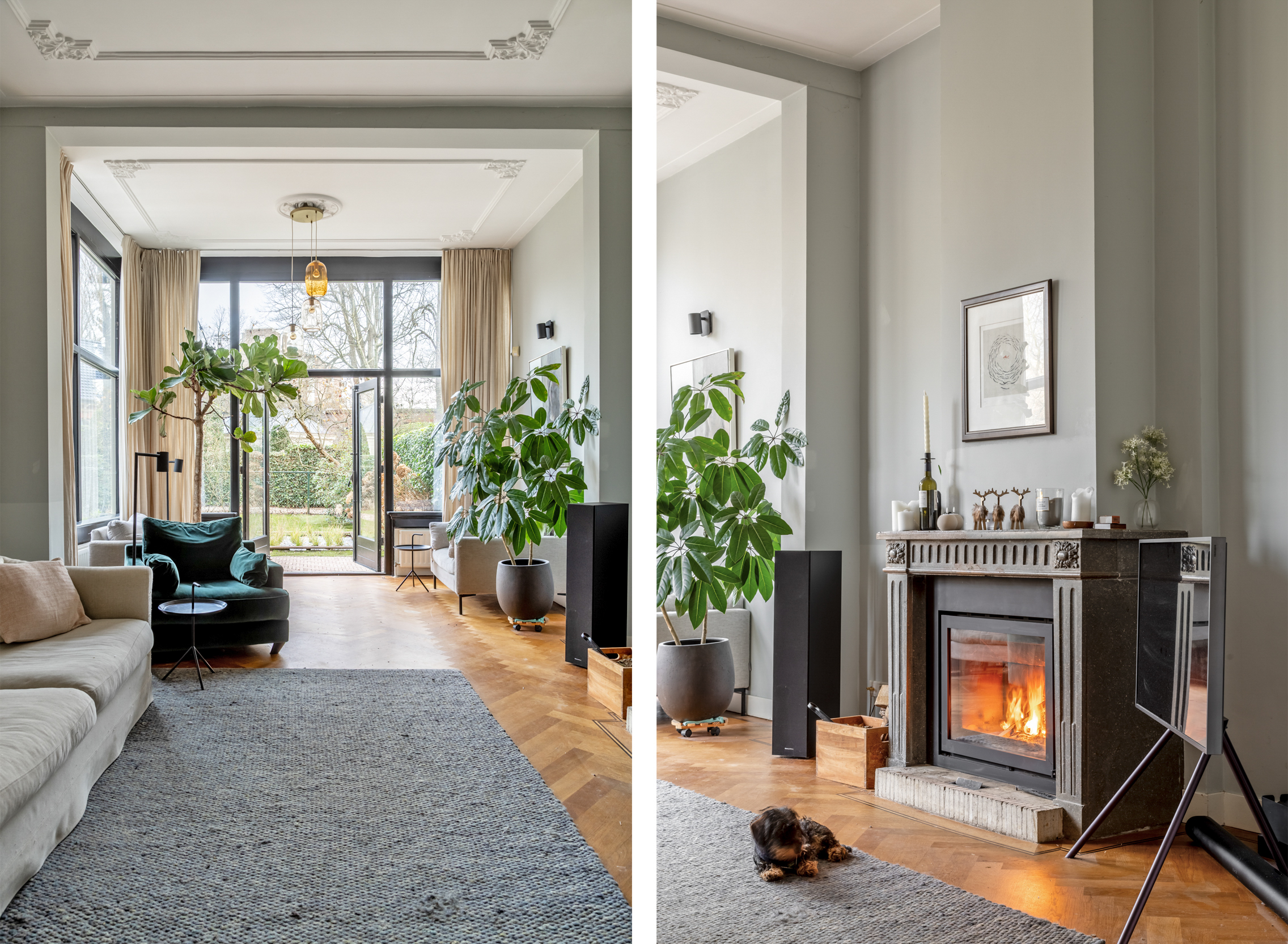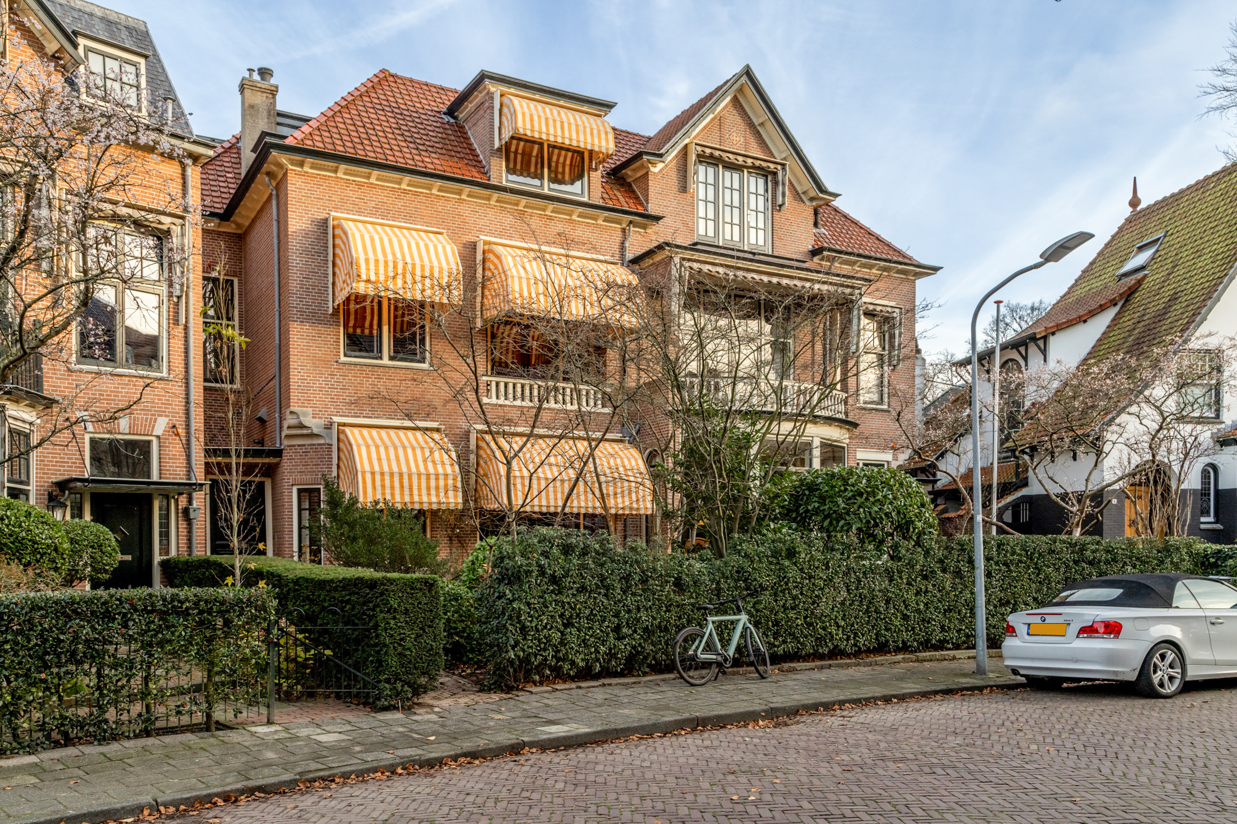 Through the front garden and entrance at the front, you enter a majestic spacious hall with separate cloakroom, elevator, and through cylinder glass plates on each floor, a view of the original stained glass skylight in the main roof and access to the various living areas. From the hall, there is access to a study/chill/television room at the rear of the house, as well as to a separate toilet. The hall leads further to the luxurious living room and kitchen at the front, which is the heart of the house, with a Lodder kitchen including a very large island with various Gaggenau appliances, Quooker, professional Gutmann extractor hood, gas fireplace, custom cabinets, and Belgian bluestone flooring. The kitchen also has large French doors to the front garden. From the kitchen, you enter the stately dining room with parquet flooring and, through stained glass sliding doors, the en-suite sitting room and conservatory with French natural stone fireplace, including a built-in Brabus fireplace. The conservatory has French doors to the sunny southeast-facing garden with a (enclosed) back entrance. The garden also has a large heated stone shed with electricity, hot water, refrigerator, and workbench, which also has direct access to the chill/television room.