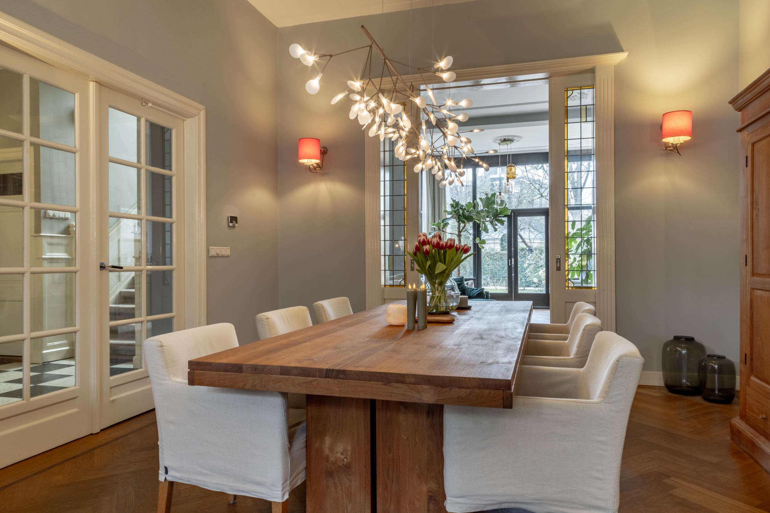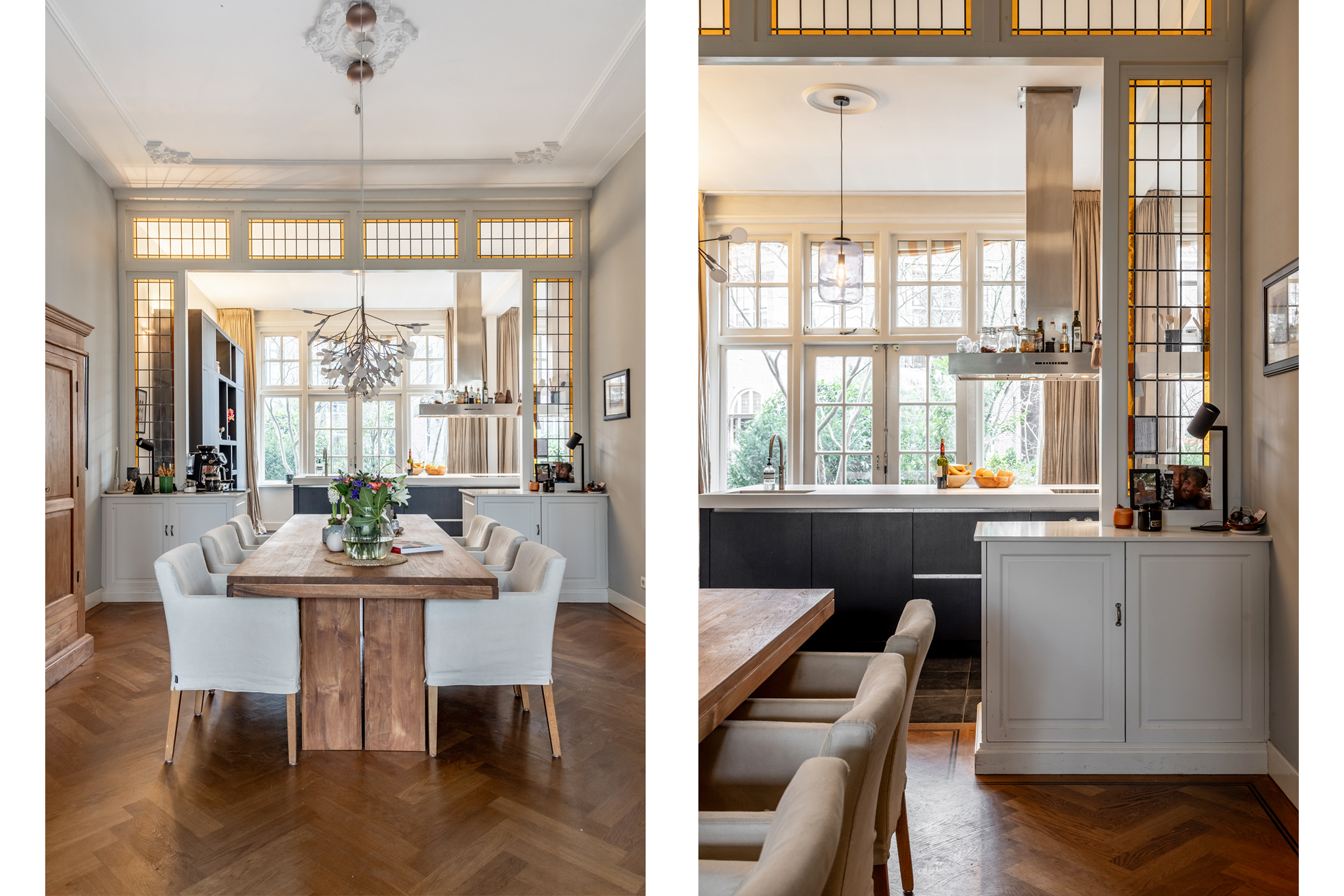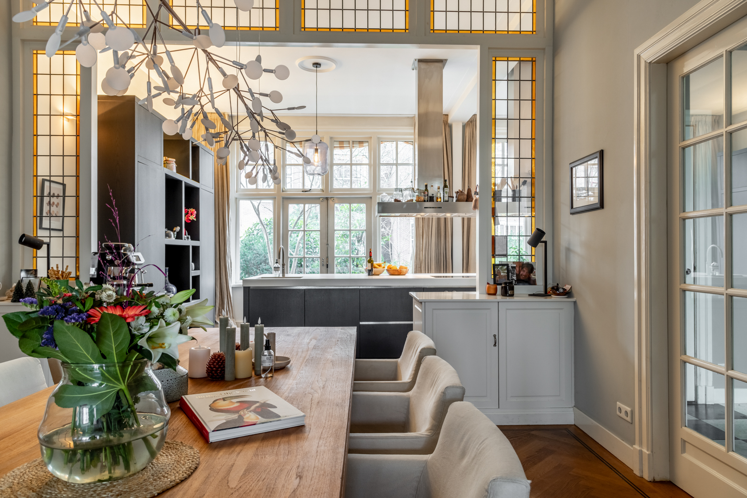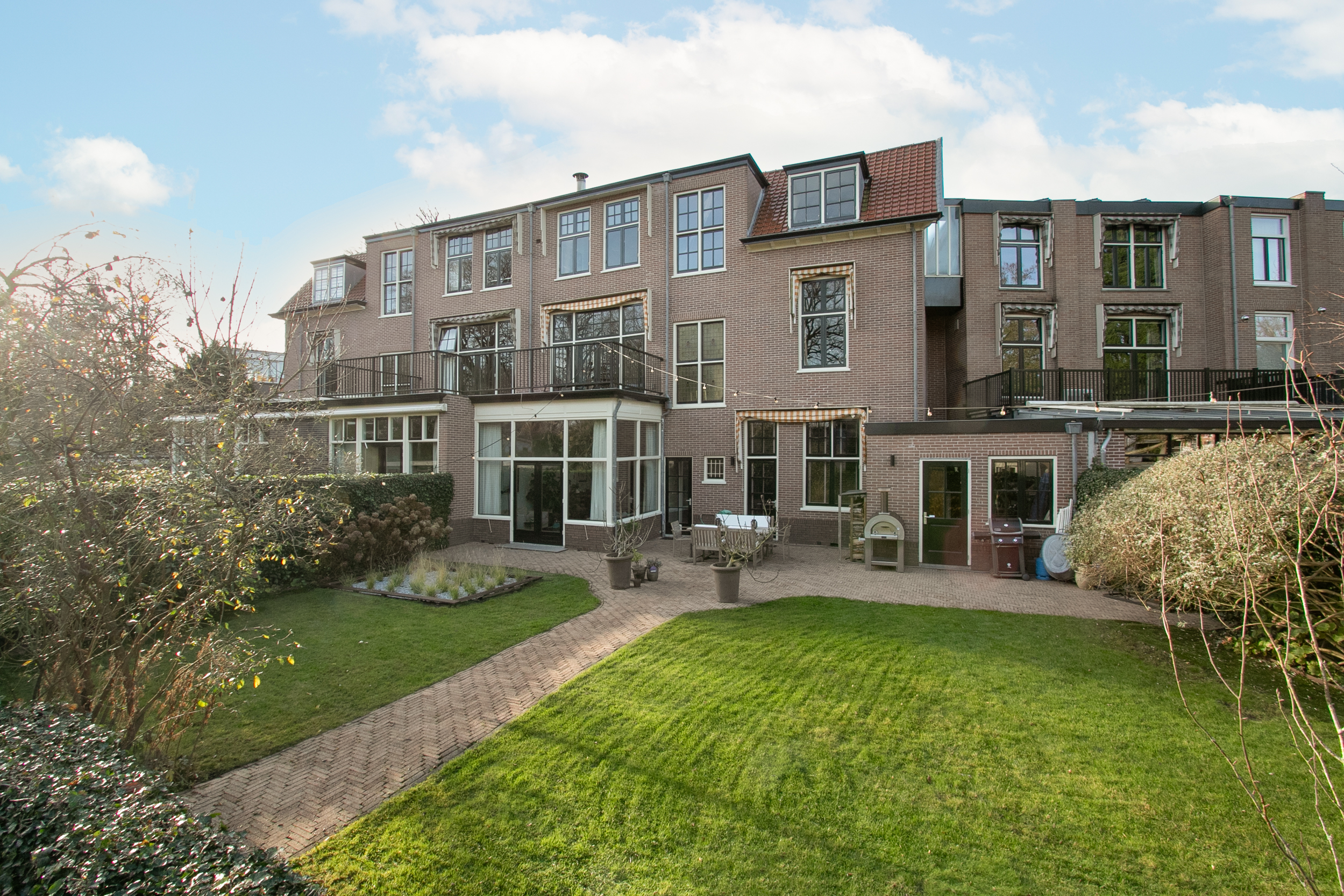 Thanks to the expansive garden and its location on the outer bend of Westerhoutpark, you will experience a sense of tranquility that feels like you are in a detached home, offering privacy and plenty of sunshine from early morning until evening. The beautiful, very wide garden and the lush surrounding plots make it a green oasis where you are surrounded by flowering cherry, quince, fig, and plum trees from early spring until well into autumn. The rural feel makes you immediately forget that you are so close to the center of Haarlem. From the garden, you look out over historic country houses such as “Groen en Hout,” “Houtrust,” and the orangery of the former estate/farmstead “Westerhout.” You can also enjoy the tranquility of the Haarlemmerhout, which is visible from the garden. The large hall and glass panels in the ceilings connect all rooms and floors in a very functional way. This keeps everyone connected in this exquisite family home, despite the many rooms.