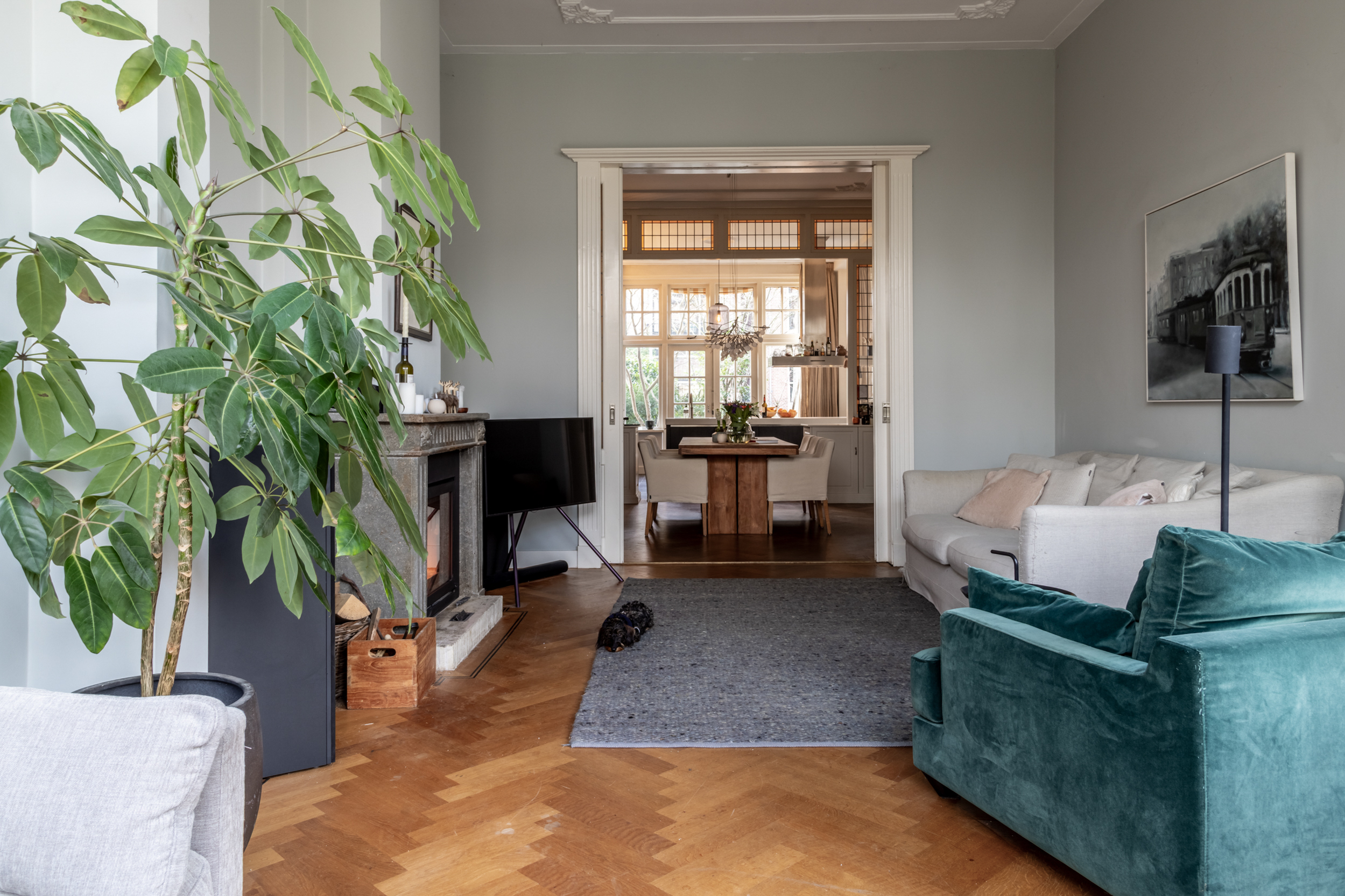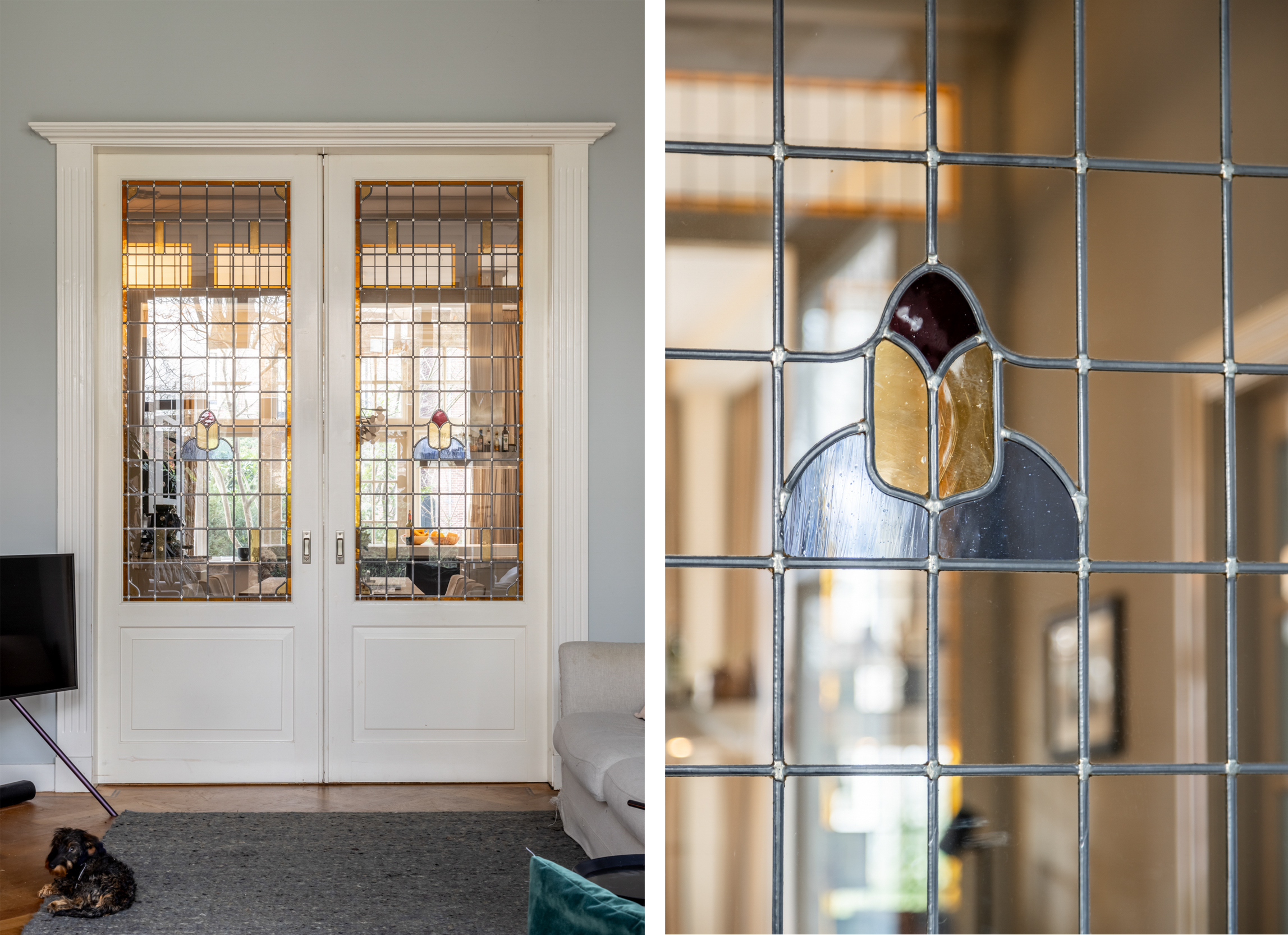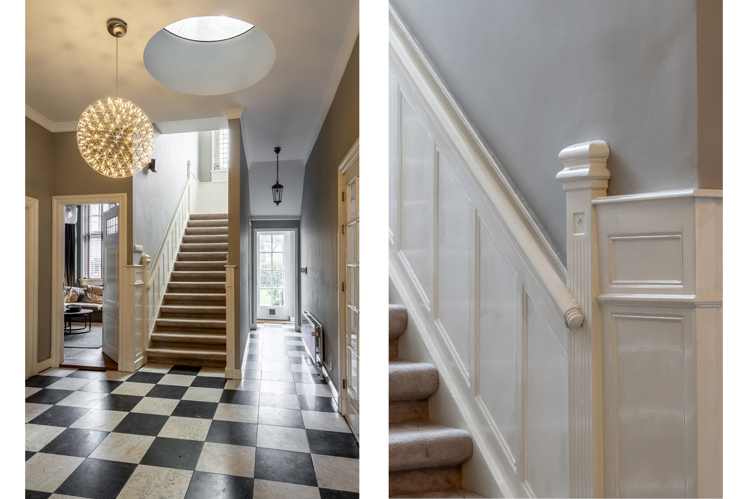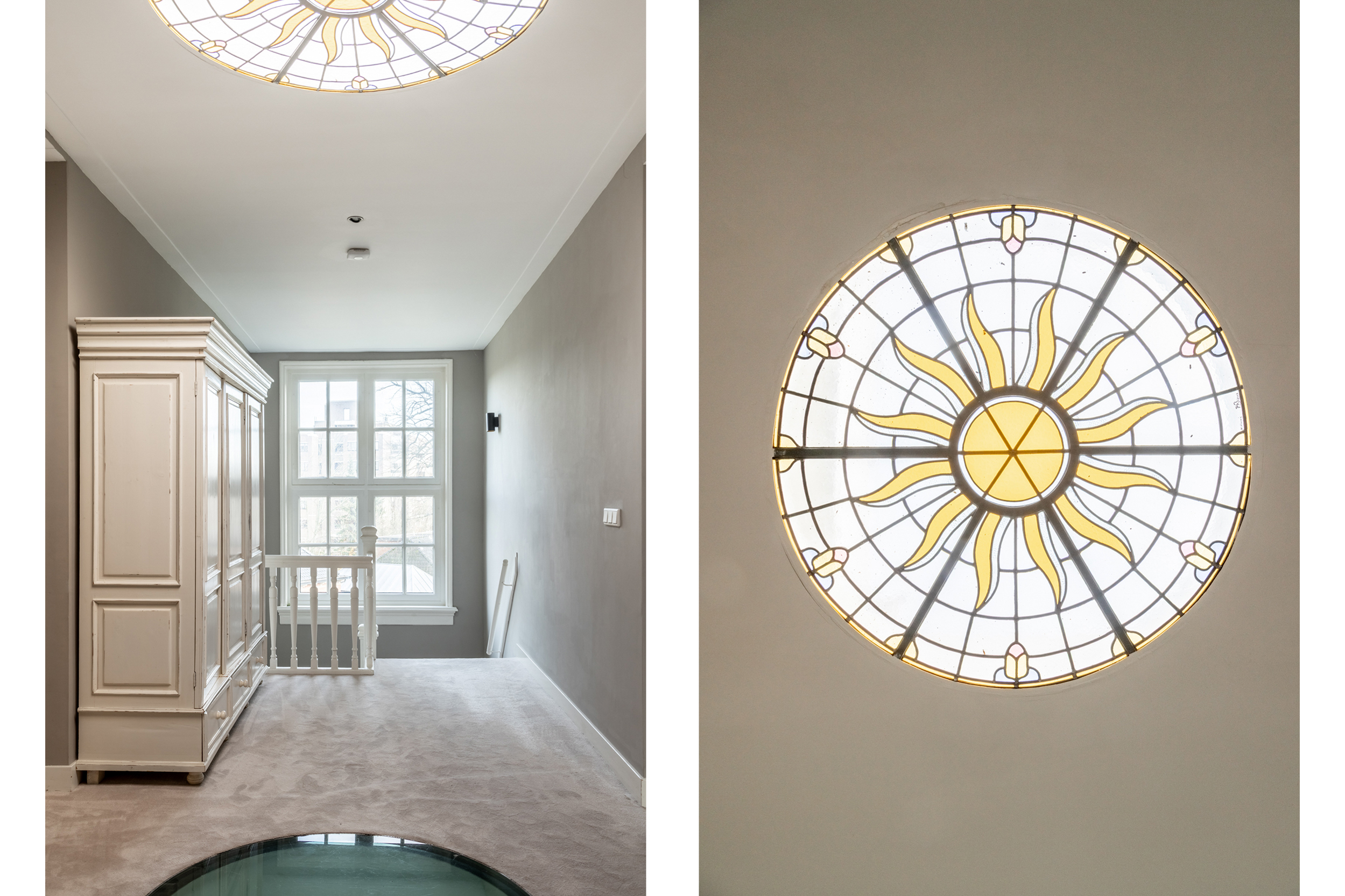 Thanks to the expansive garden and its location on the outer bend of Westerhoutpark, you will experience a sense of tranquility that feels like you are in a detached home, offering privacy and plenty of sunshine from early morning until evening. The beautiful, very wide garden and the lush surrounding plots make it a green oasis where you are surrounded by flowering cherry, quince, fig, and plum trees from early spring until well into autumn. The rural feel makes you immediately forget that you are so close to the center of Haarlem. From the garden, you look out over historic country houses such as “Groen en Hout,” “Houtrust,” and the orangery of the former estate/farmstead “Westerhout.” You can also enjoy the tranquility of the Haarlemmerhout, which is visible from the garden. The large hall and glass panels in the ceilings connect all rooms and floors in a very functional way. This keeps everyone connected in this exquisite family home, despite the many rooms.
