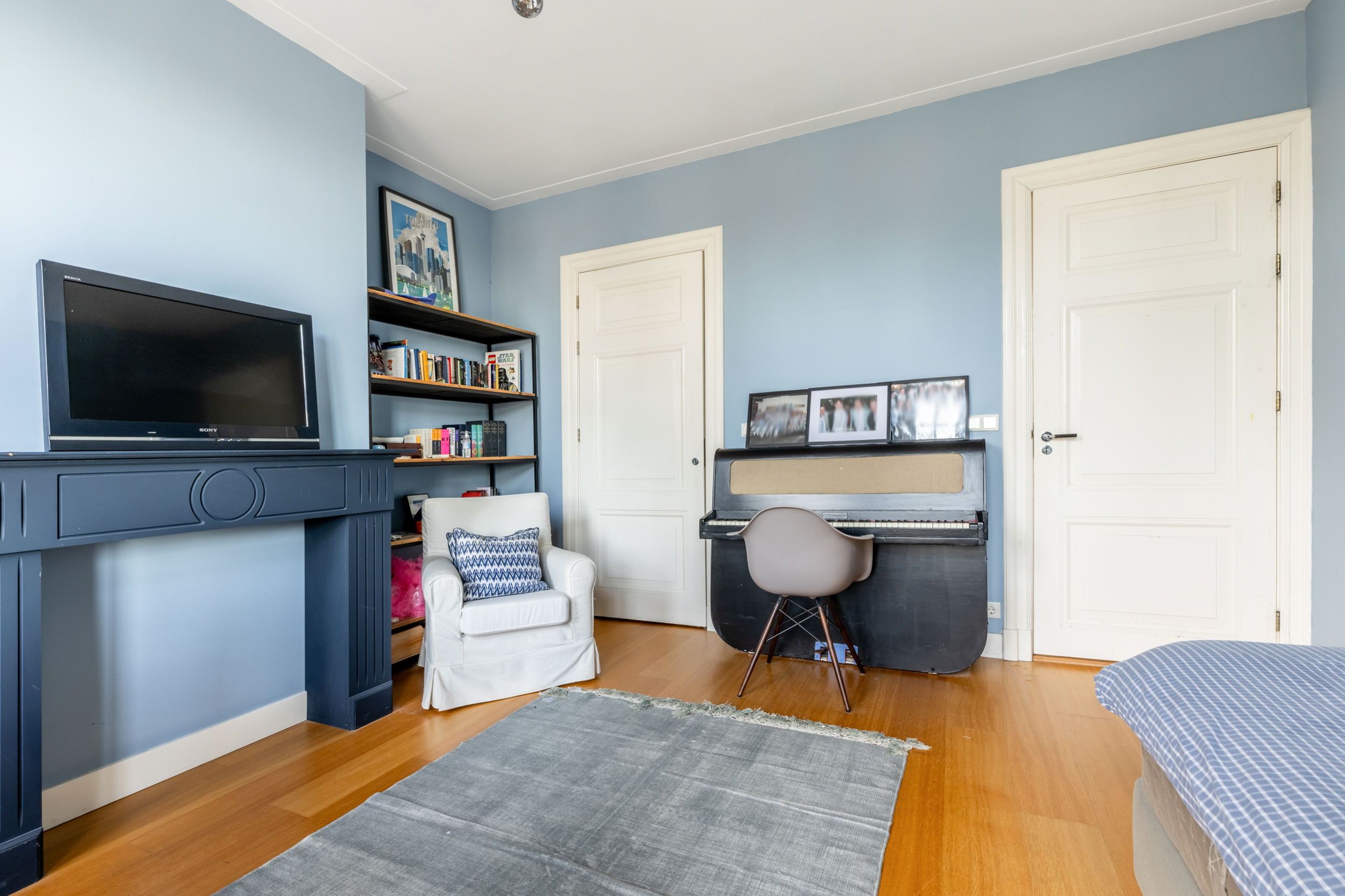 The first floor is accessible via the beautiful staircase with original stained glass windows. The spacious landing with toilet provides access to several bedrooms. At the rear are two spacious bedrooms, one of which is the master bedroom with a roof terrace, French natural stone fireplace, and walk-in closet. At the front is a third spacious bedroom with an indoor balcony and built-in bookcase. The floor also has a luxurious bathroom with a bathtub, double shower, natural stone double sink, and built-in closet. Adjacent to the bathroom is a separate large laundry room with the central heating system behind it.