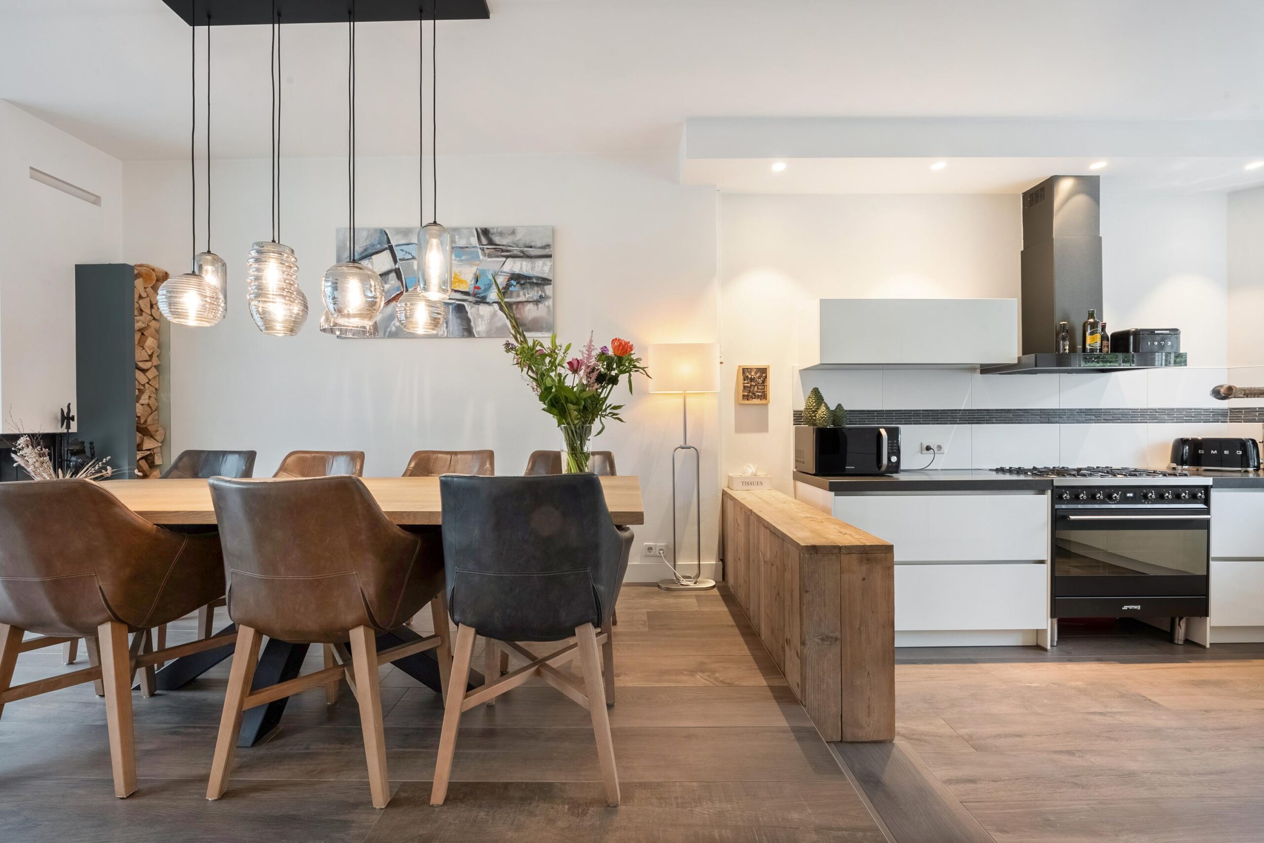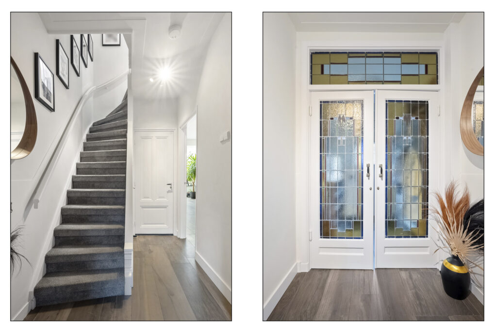 Parterre: entree, vestibule, hal met verdiepte trapkast en zeer ruim zwevend toilet met fontein, royale, uitgebouwde woonkamer met houtkachel, grote lichtstraat, deur en openslaande deuren naar tuin, moderne keuken met diverse inbouwapparatuur, 6-pits Smeg gasfornuis en erker met glas-in-lood ramen, via hal trap naar….