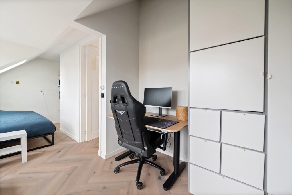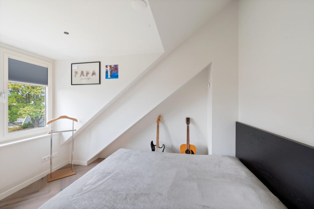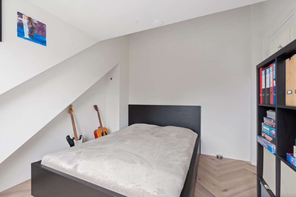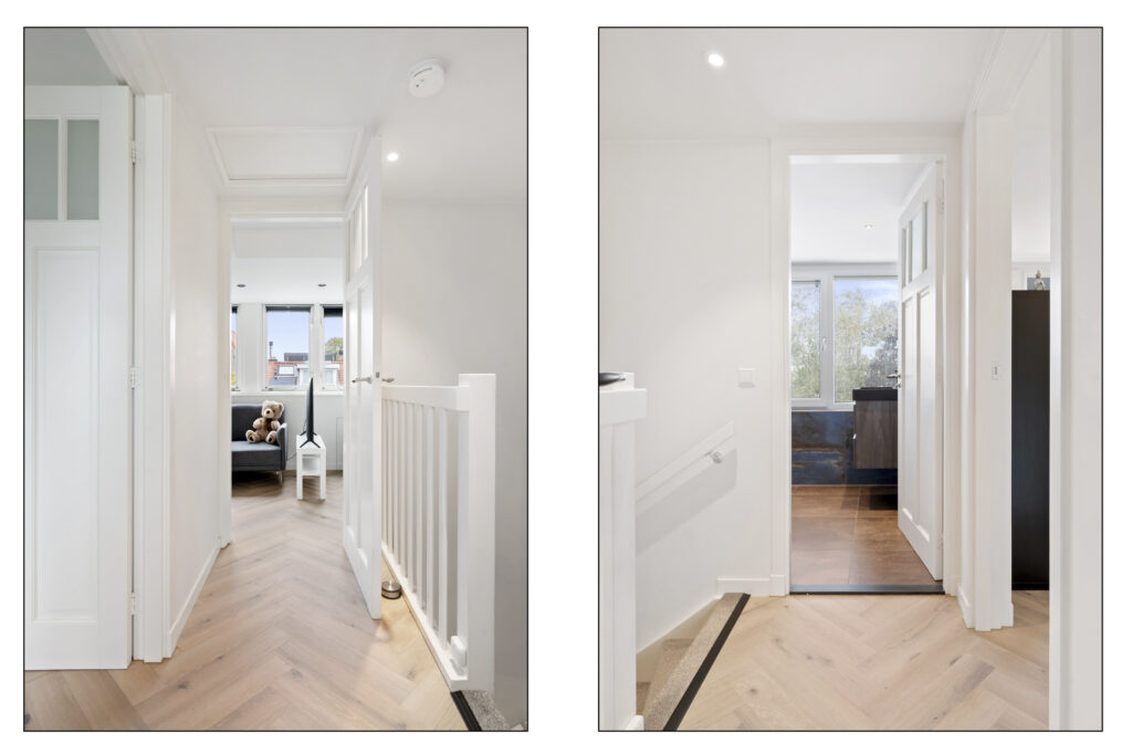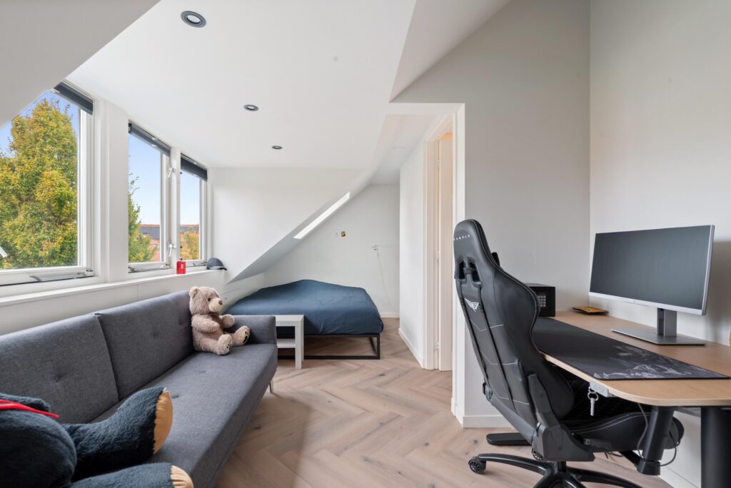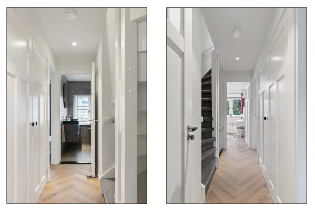 2e Verdieping: ruime overloop met toegang naar bergvliering, slaapkamer aan voorzijde met dakkapel, Velux dakraam en kast met cv-installatie, slaapkamer aan achterzijde met dakkapel, 2e moderne badkamer voorzien van inloopdouche met handdouche en rainshower, wastafelmeubel, zwevend toilet, handdoekradiator en dakkapel